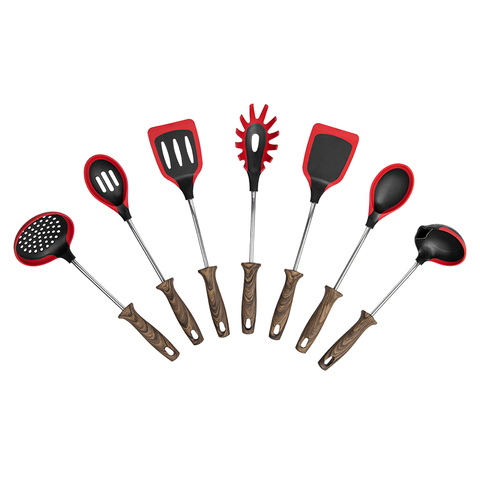 לוגו מותאם אישית מטבח סיליקון עמיד כלים 8 יח 'אשור עץ + ידית ניילון ידית אדמדם שחור אדמדם